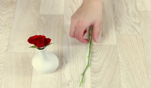 - Escoge una rosa que deseas plantar. Quita las hojas, corta el capullo y parte del tallo, unos 3 cm. Haz el corte en el tallo en un ángulo de 45 grados.