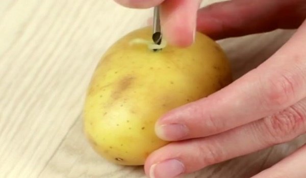 - Toma la patata y, haciendo el uso del taladro, haz un agujero de tamaño suficiente para insertar el tallo de la rosa. El agujero debe ser pequeño, para que la rosa no pierda la estabilidad.