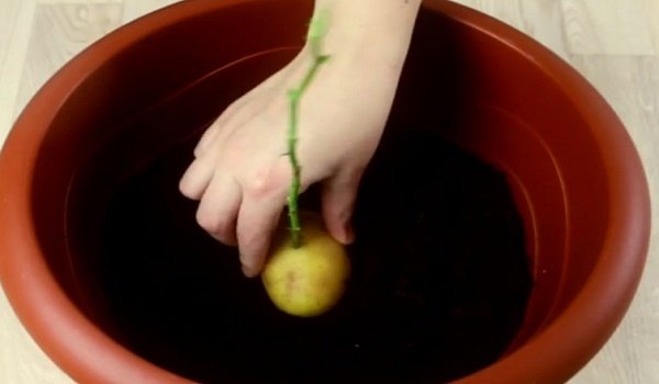 - Llena la maceta con tierra, formando una capa de 5 cm de espesor. Coloca la patata con la rosa sobre el suelo y rellena la maceta.