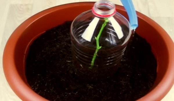 - Corta la parte inferior de una botella de plástico, deséchala. Utiliza la parte superior para cubrir el tallo. De esta forma, se logra el efecto invernadero. Procura evitar que el agua caiga sobre el tallo. Para ello, vierte el líquido alrededor de la botella de plástico.