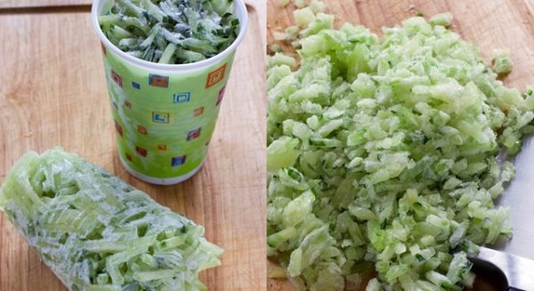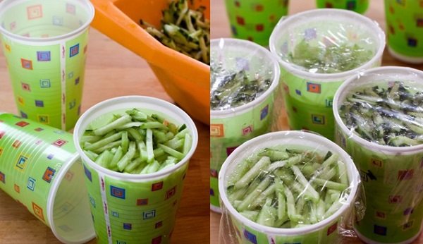 Para que el trabajo sea cómodo, antes de congelar los pepinos, estos deben ser lavados y cortados en tiras finas. Para ello, puedes auxiliarte de un rallador de zanahorias a lo coreano.