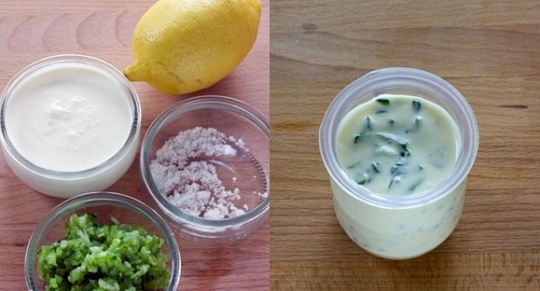 Mezcla 200 g de mayonesa o crema salada y 50 g de pepinos congelados. Añádele 20 ml de zumo de limón y una cucharadita de azúcar. ¡Hecho!