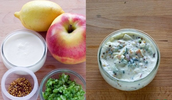 A 200 ml de crema líquida, añádele 50 g de pepino, 20 ml de zumo de limón, un cuarto de manzana pasada por el rallador, y 1 cucharada de pastosa o mostaza granulada.