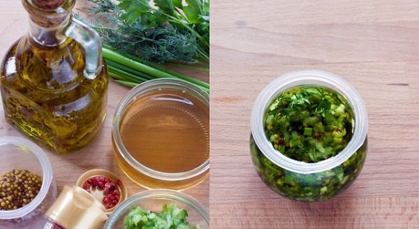 Muele 30 g de cebollas verdes con otras hierbas al gusto, y mézclalas con 70 g de pepinos. Añádele una cucharada de mostaza, la misma de vinagre o vino, 70 ml de aceite de oliva, sal, azúcar y pimienta al gusto.