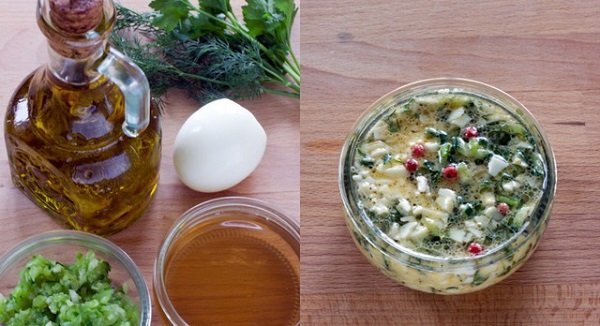 Tritura la yema del huevo con una pizca de sal y azúcar. Añádele 1 cucharada de vino o vinagre de sidra. A continuación, añádele 30 g de pepino, la clara del huevo bien picadita, productos verdes al gusto y 50 ml de aceite de oliva.