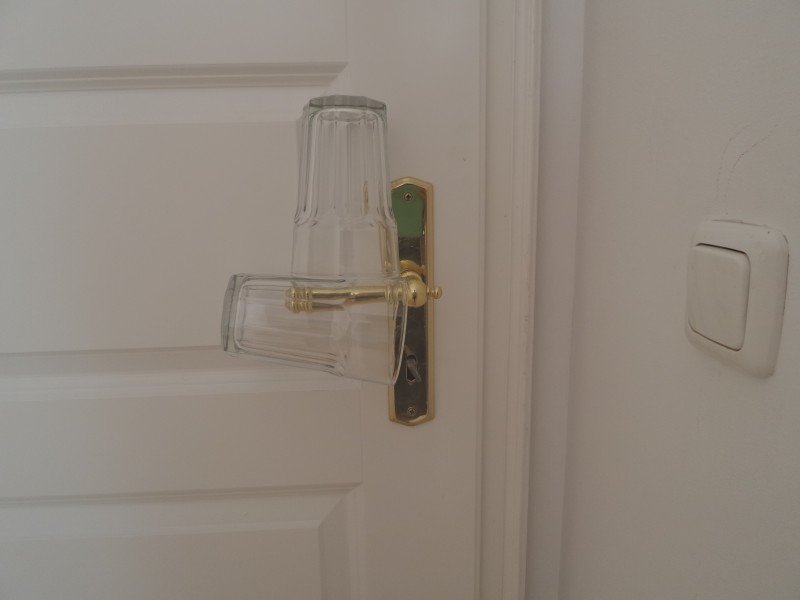 Luego pon el otro encima del primero. ¡Ahora, si alguien trata de tirar de la manija de la puerta en medio de la noche, enseguida se escuchará el ruido de la loza rota! Este sistema de alarma funciona de maravilla…