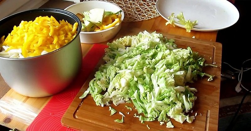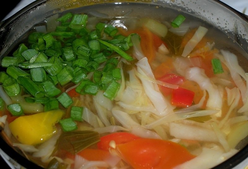 - La hortaliza se pica finamente (los tallos jóvenes pueden cortarse en trozos más grandes), las zanahorias se cortan en anillos puede estar semielaborada, se escaldan los tomates y se pelan, luego se cortan. Pimientos búlgaros cortados en barras, dados de cebolla y apio.