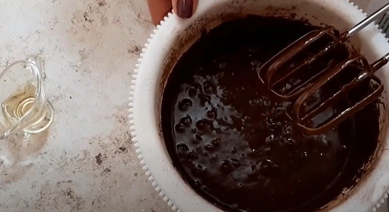 - Para hacer el fondant, agrega azúcar y cacao en una cacerola. Vierte agua y agrega mantequilla. Hierve durante 2 minutos, revolviendo constantemente. Cuando el glaseado esté listo, apaga el fuego y agrega el aceite vegetal. Mezcla bien.