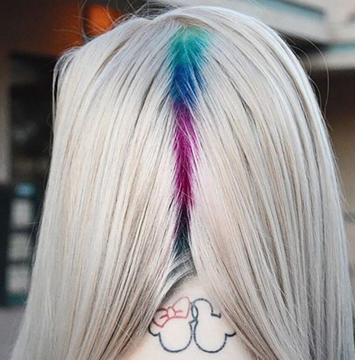 Para el cabello negro, puedes elegir una franja de chocolate, fuego y tono claro, y una combinación de azul profundo, rosa, esmeralda o púrpura increíble.