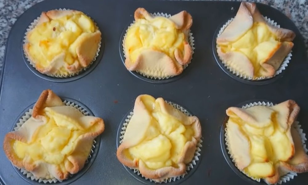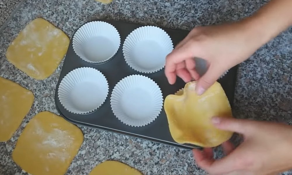 - A continuación, pon la cuajada terminada en los moldes, y envuelve los bordes colgantes de la masa dentro de cada bizcocho.