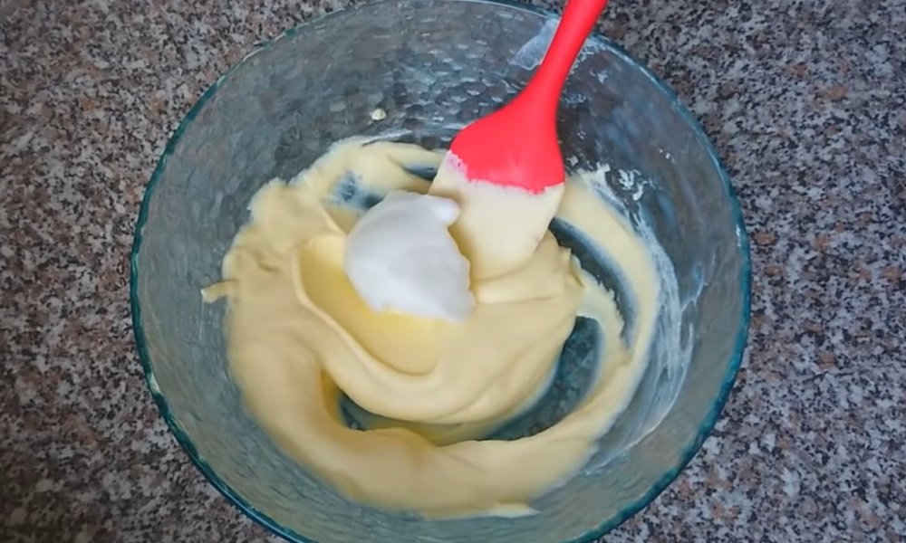 ¡Atención! Bate la clara de huevo por separado en una batidora hasta obtener una espuma espesa. Y solo después de eso, mezcla cuidadosamente la masa en la crema.