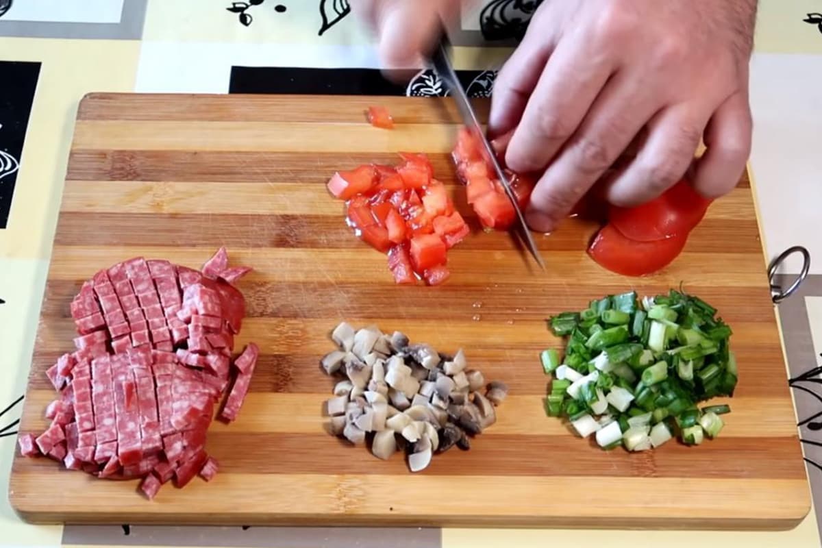 - A continuación, corta todos los ingredientes necesarios en dados pequeños: champiñones, alguna salchicha, cebolla y tomate.