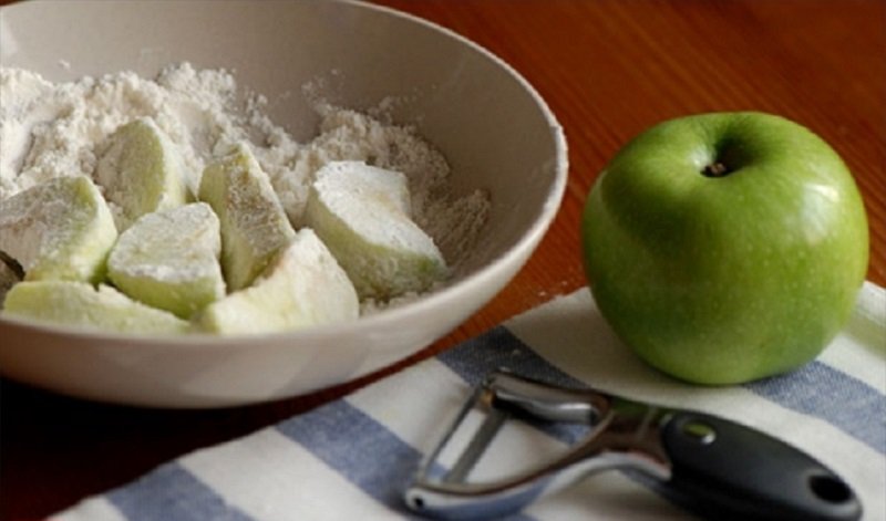 - Enharina los pedazos de manzana Charlotte, para que no se desmoronen.