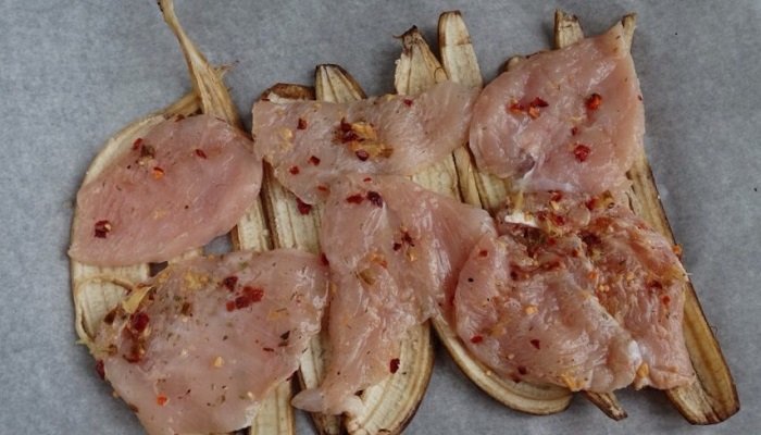 - Coloca la cáscara de plátano sobre la bandeja para hornear untada con mantequilla. Coloca la carne sobre la cáscara, y pon la bandeja en el horno. De esta manera, lograrás no solamente mejorar el sabor de la carne, sino también, evitar que se queme a la bandeja.