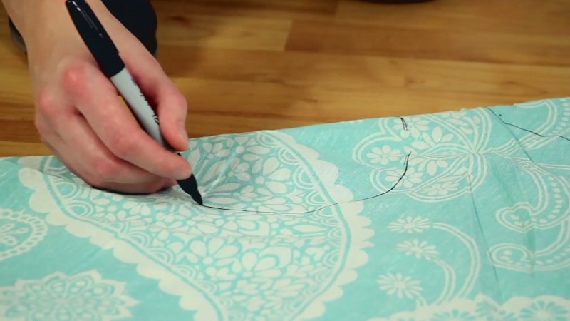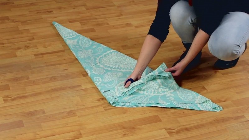 - Ahora dobla el triángulo a lo largo, tal y como se ve en la imagen. ¡La idea es doblar la tela, de forma similar al proceso de fabricación de un avión de papel! Marca el resto de la pieza, que necesita ser cortada.