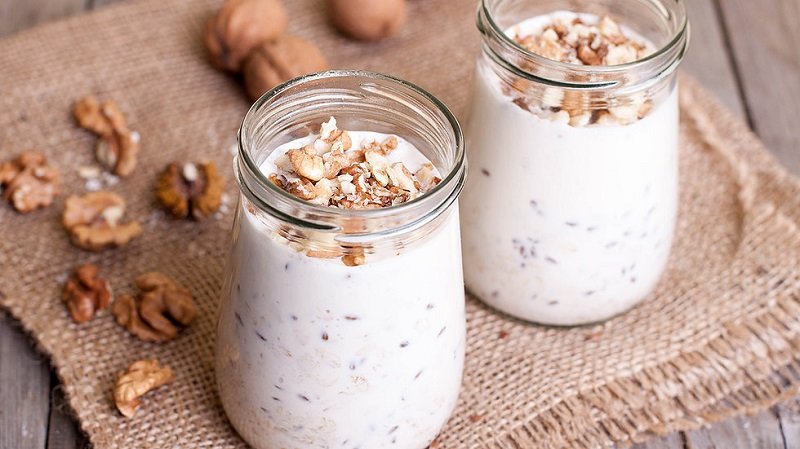 - En un recipiente aparte, combina aceite de linaza, copos de avena, cacao en polvo y yogurt natural. Revuelve bien todos los ingredientes.